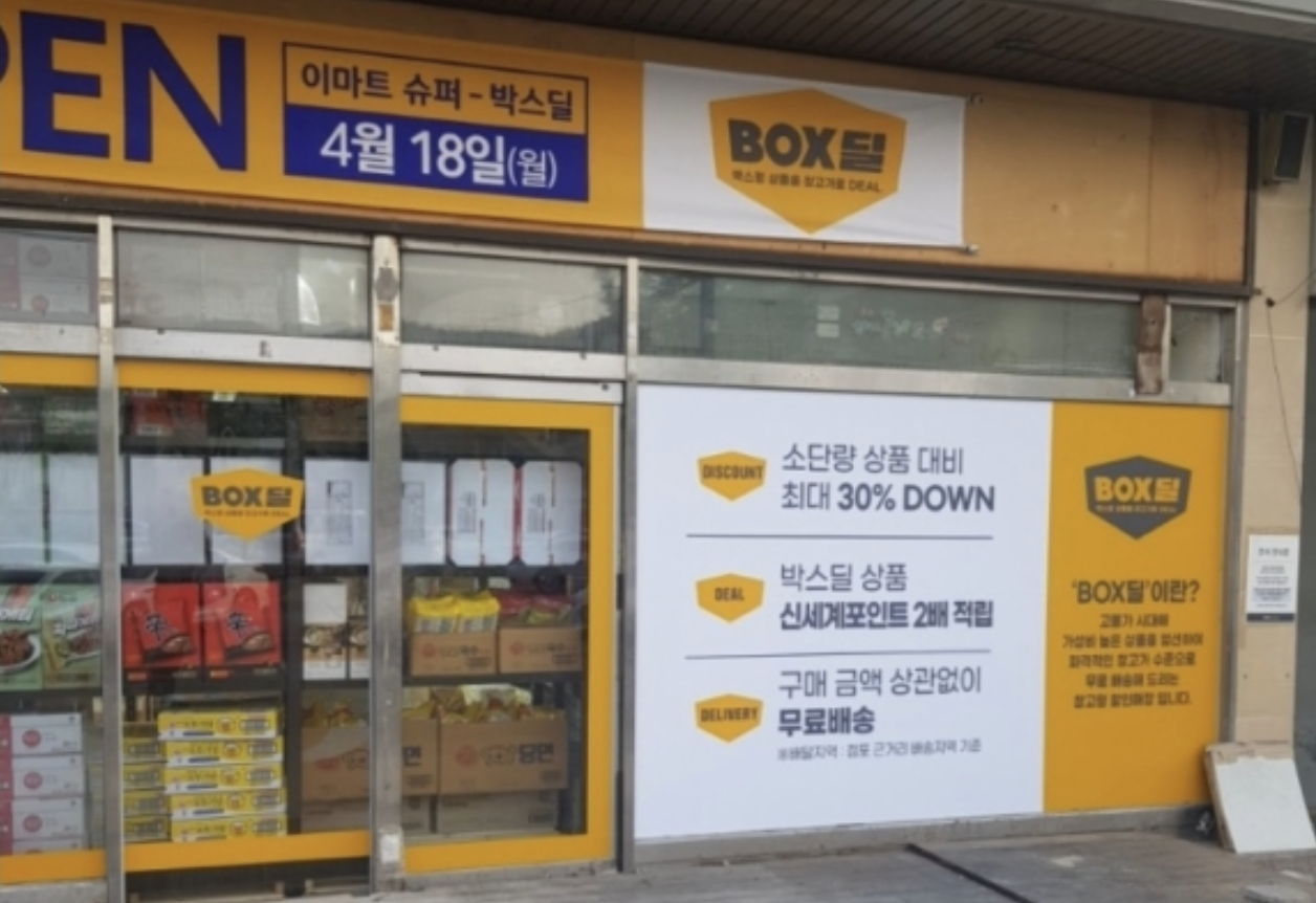 2022년 4월 25일 유통업계에 따르면 이마트 에브리데이에서는 지난해 12월부터 일부 점포에서 '박스딜'을 선보였다. 박스딜이란 창고가 수준으로 물건을 저렴하게 판매하는 서비스다. 소단량 대비 최대 30% 가격이 저렴하다. 무료로 배송받아 볼 수 있으며, 신세계포인트를 2배로 적립받을 수 있다.